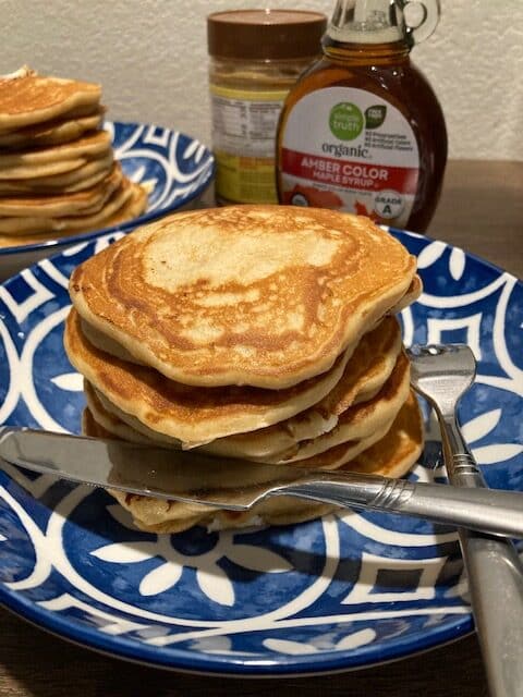 Breakfast Honey-Bunny Peanut-Buddy Pancakes by admin November 18, 2025 37 “I love when my son and I create in the kitchen, because it brought us closer. When I saw this contest in my email, we welcomed this challenge. And because we love peanut butter! After I was diagnosed with cancer in 2016, cooking and eating great food became more intentional (when I was able to cook after chemotherapy), and an opportunity for my son to learn how to cook/bake, like I did when my grandmother taught me. We love breakfast food, especially pancakes, so we decided on peanut butter pancakes.” – Marsha, Arizona Honey-Bunny Peanut-Buddy Pancakes Print Recipe Nutrition facts: 200 calories 20 grams fat Rating: 5.0/5 ( 1 voted ) Ingredients Yields: 12-14 pancakes Dry Ingredients: 1 1/2 Cups of Unbleached All-Purpose Flour 3 Tablespoons of Light Brown Sugar 1 1/2 Teaspoons of Baking Powder 1/2 Teaspoon of Baking Soda 1/2 Teaspoon of Sea Salt plus a pinch Wet Ingredients: 1/2 Cup of Honey Peanut Butter 2 Tablespoons Sunflower Oil 1 3/4 Cups of Buttermilk, Room Temperature 1 Large, Cage-Free Egg 1 Teaspoon of Vanilla Extract Unsalted Butter for the pan, one or two tablespoons Other Ingredients: 1/3 Cup of Vanilla Chips (or Toffee Bits) Instructions In a large bowl, whisk together the flour, baking powder, baking soda, salt, and sugar, and set to the side. In a medium bowl, mix all the wet ingredients until well incorporated and smooth. Make a well in the middle of the bowl, and pour in the wet ingredients mixture. Mix until the pancake batter until smooth, being careful not to over mix. Heat a non-stick griddle or large pan over medium-high heat. Once the pan is hot, melt butter on the hot surface. If you're using an electric griddle, heat it somewhere between 300 and 350 F. Pour ¼ cup of pancake batter onto the greased pan. Cook the pancakes for about 2-3 minutes, until the edges begin to look defined and bubbles form. Flip the pancakes over and cook for another minute or two on the other side. Avoid pressing down on the pancake after flipping; this will cause denser and chewy pancakes and undercooked batter. Remove the pancakes from the pan onto a plate and keep them warm under aluminum foil, or in an warm oven while you cook the rest of the batter. Serve peanut butter pancakes with warm organic syrup, or your favorite toppings, and enjoy! Holiday Recipe Contest 2025 0 FacebookTwitterPinterestEmail previous Peanut Butter Apple and Bacon Breakfast Sandwich next Peanut Butter Protein Pancakes Two Ways (Gluten Free Naturally) More Like This PBJ Peanut-Crunch Cinnamon Rolls Peanut Butter Protein Pancakes Two Ways (Gluten Free... Peanut Butter Apple and Bacon Breakfast Sandwich Peanut Butter Bacon Breakfast Burrito Peanut Butter Apple Breakfast Tarts Peanut Butter Banana Oatmeal PB Cocoa Chia Pudding Peanut Butter Sweet Potato Bread Chocolate PB Granola Peanut Butter Smoothie Cubes